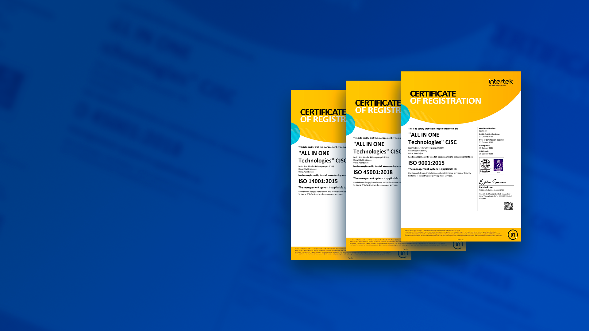 All in One Technologies CJSC has been awarded ISO certifications confirming its compliance with internationally recognized standards. The company’s management system has been assessed by Intertek, a reputable international certification body, and verified to meet the relevant ISO requirements.